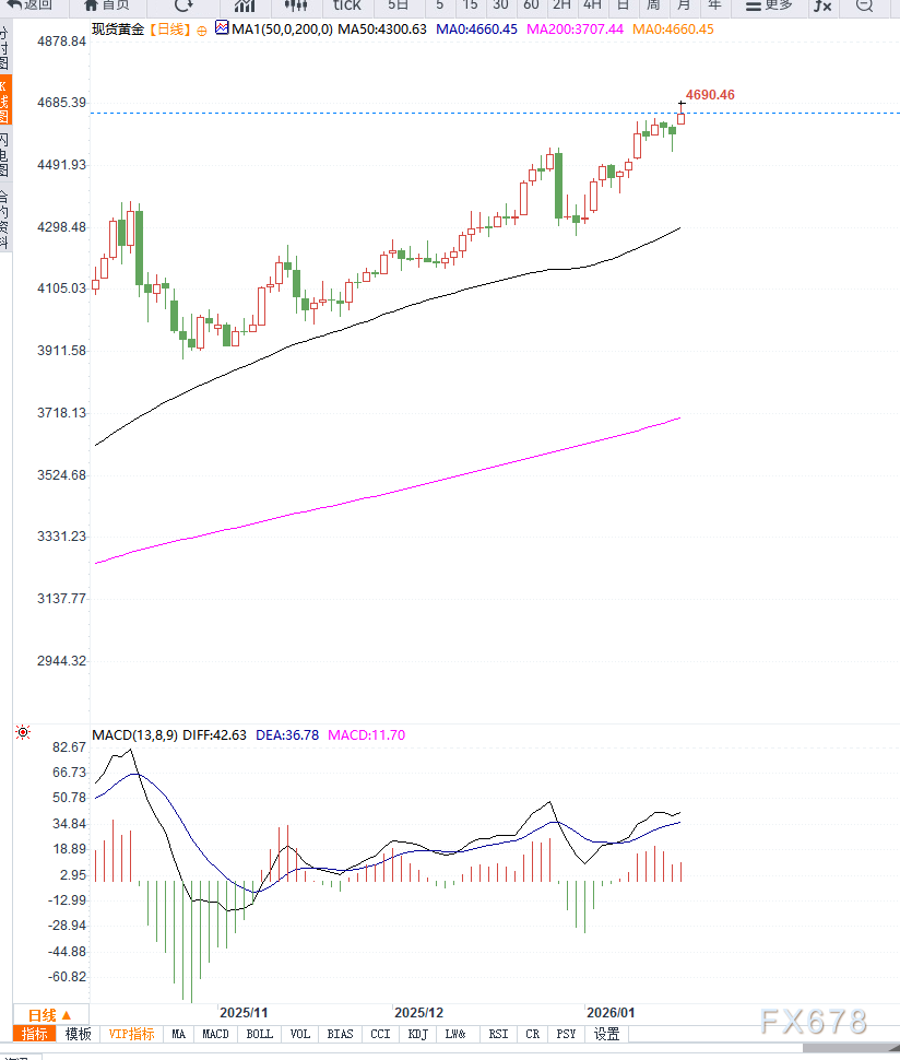从日线来看,黄金价格在4675美元附近维持强势,多头趋势明显。价格沿5日均线持续上行,短期回踩幅度有限,显示多头控盘力强。5日、10日和20日均线呈多头排列,短期均线贴身支撑,日线结构处于主升浪阶段。